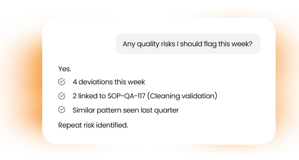“Pharma AIssist reduced the effort required to investigate deviations and prepare audit documentation. Quality and manufacturing teams were able to respond faster to regulators while maintaining consistency across plants and regions.”
