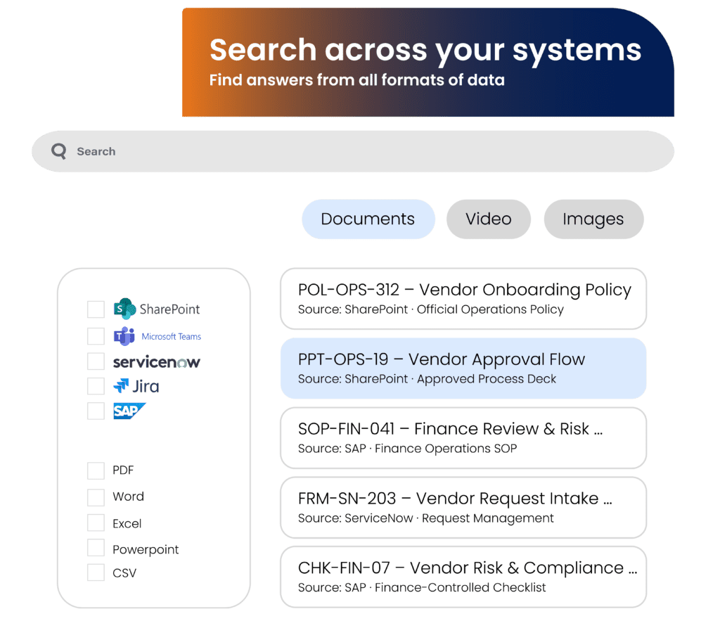 Surface trusted answers from documents, systems, and business applications through one contextual layer.